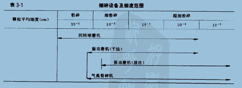 陶瓷工業(yè)中的粗碎設(shè)備一般用顎式破碎機(jī),中碎采用輪碾機(jī),細(xì)碎則用球磨機(jī)或環(huán)輥磨機(jī)兩種。另外產(chǎn)量、顆粒形狀與細(xì)度的要求不同而采用籠式打粉機(jī)、錘式打粉機(jī)以及振動磨等破粉碎設(shè)備。常用細(xì)碎設(shè)備所能達(dá)到的細(xì)度列于表中,如下圖。